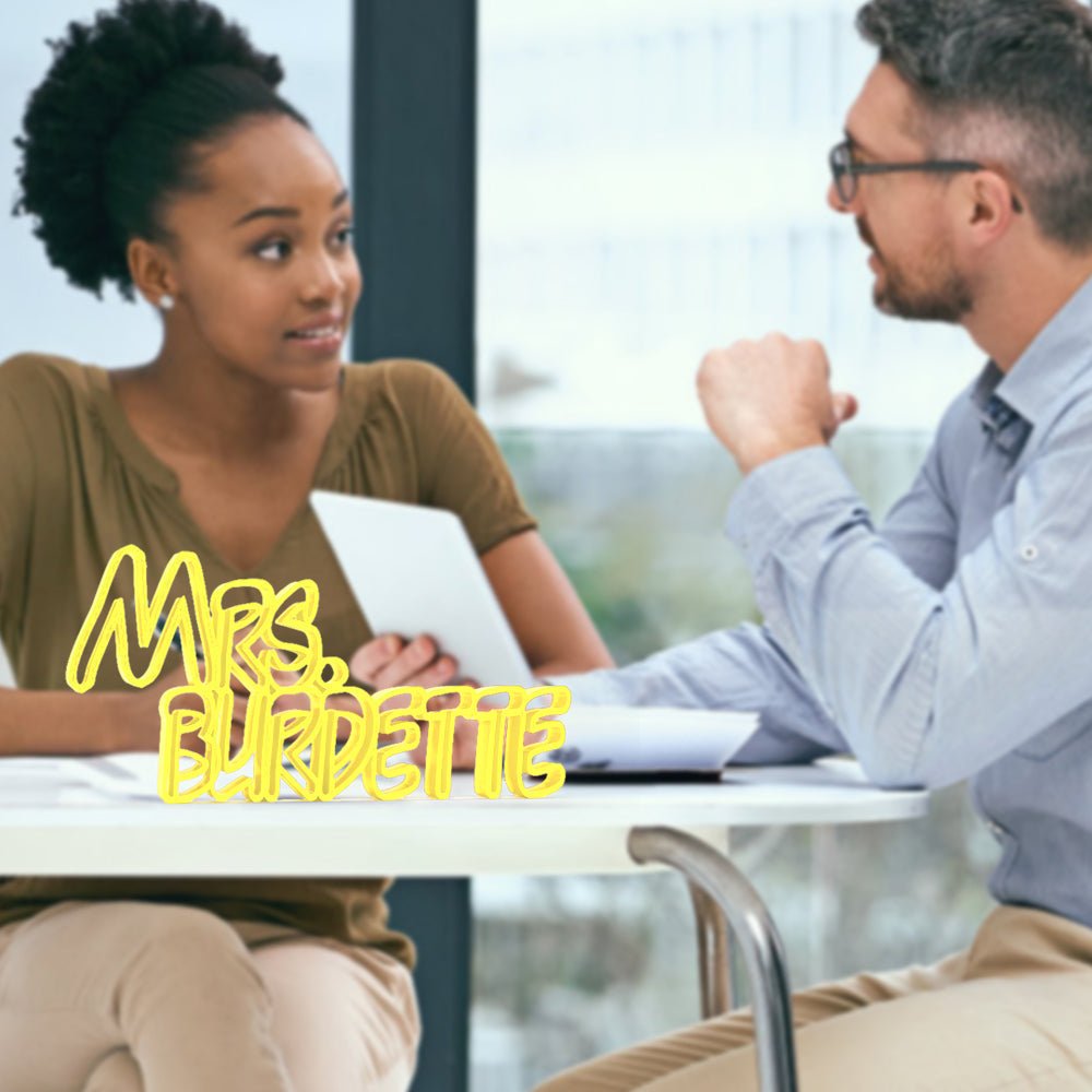 Make your workspace stand out with this personalized desk name plate. We design it specifically for you, adding a modern touch to any office. The name plate clearly displays your name and title, helping you make a strong first impression. It sets a professional tone and creates a welcoming atmosphere for visitors, clients, and coworkers.