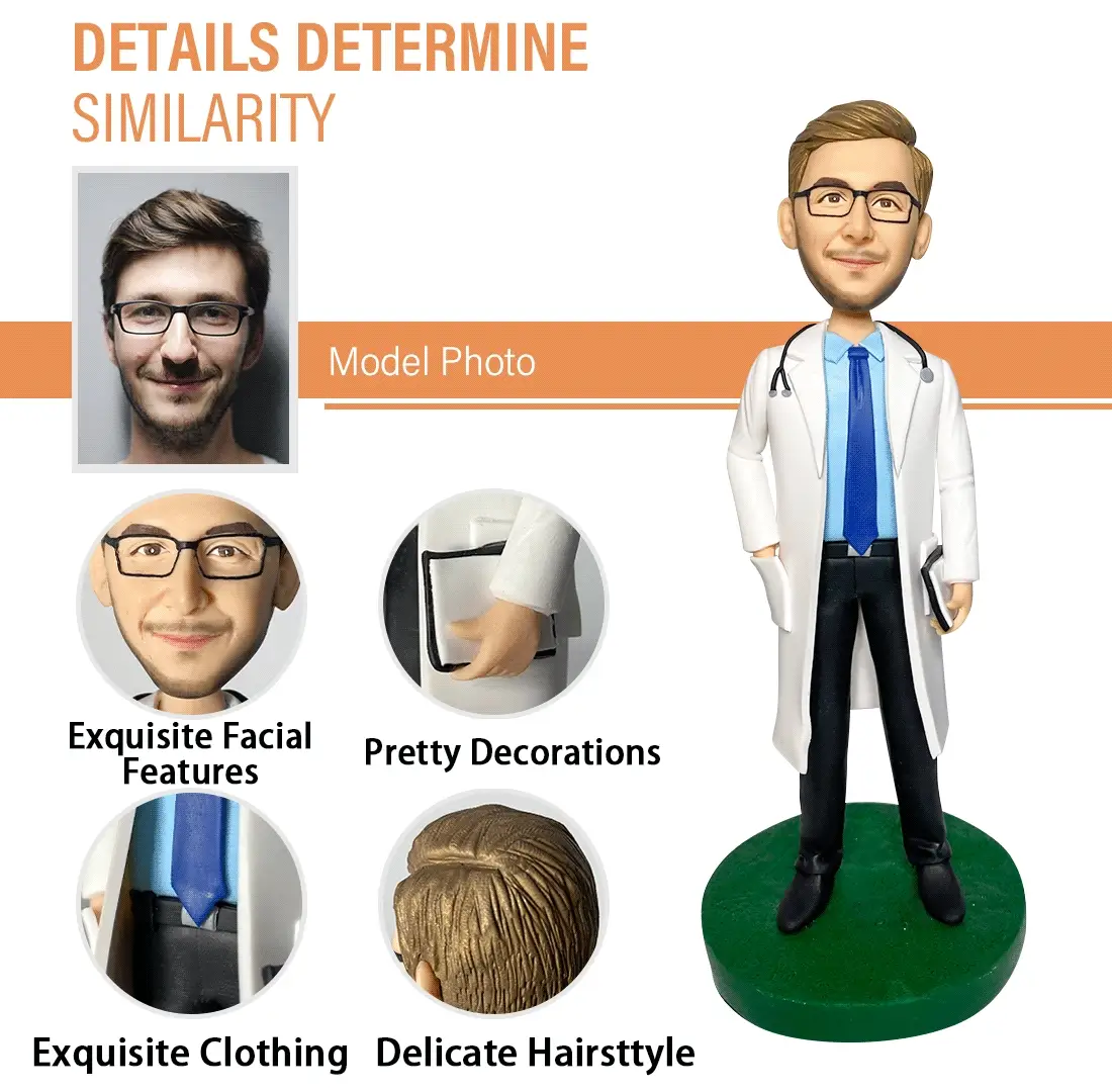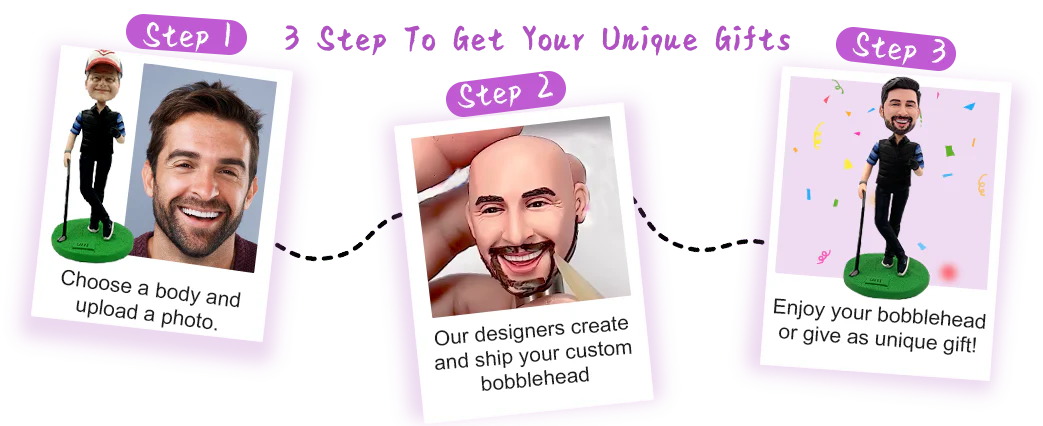 This custom Bobblehead focuses on facial likeness while keeping a consistent body design. Artists customize only the head using your photo, and they create the body based on the product pictures. As a result, the final figurine keeps the same pose and outfit style shown in the reference images while still reflecting the person’s identity.