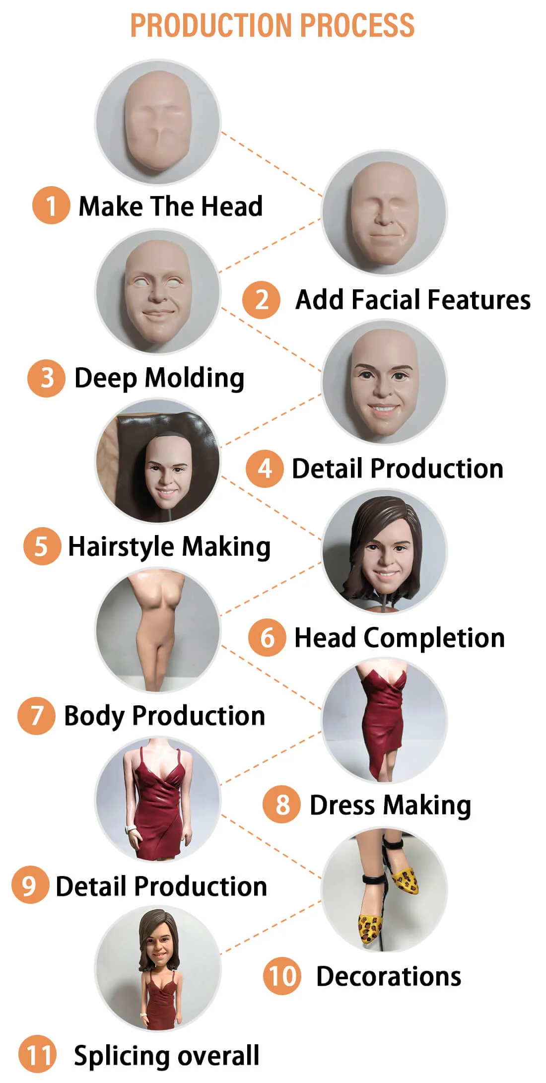 You can choose between Stationary Head and Bobble Head styles. The Stationary Head supports many hairstyle options, including long, medium, and short hair. In addition, artists shape facial expressions and hair details carefully for a realistic finish.